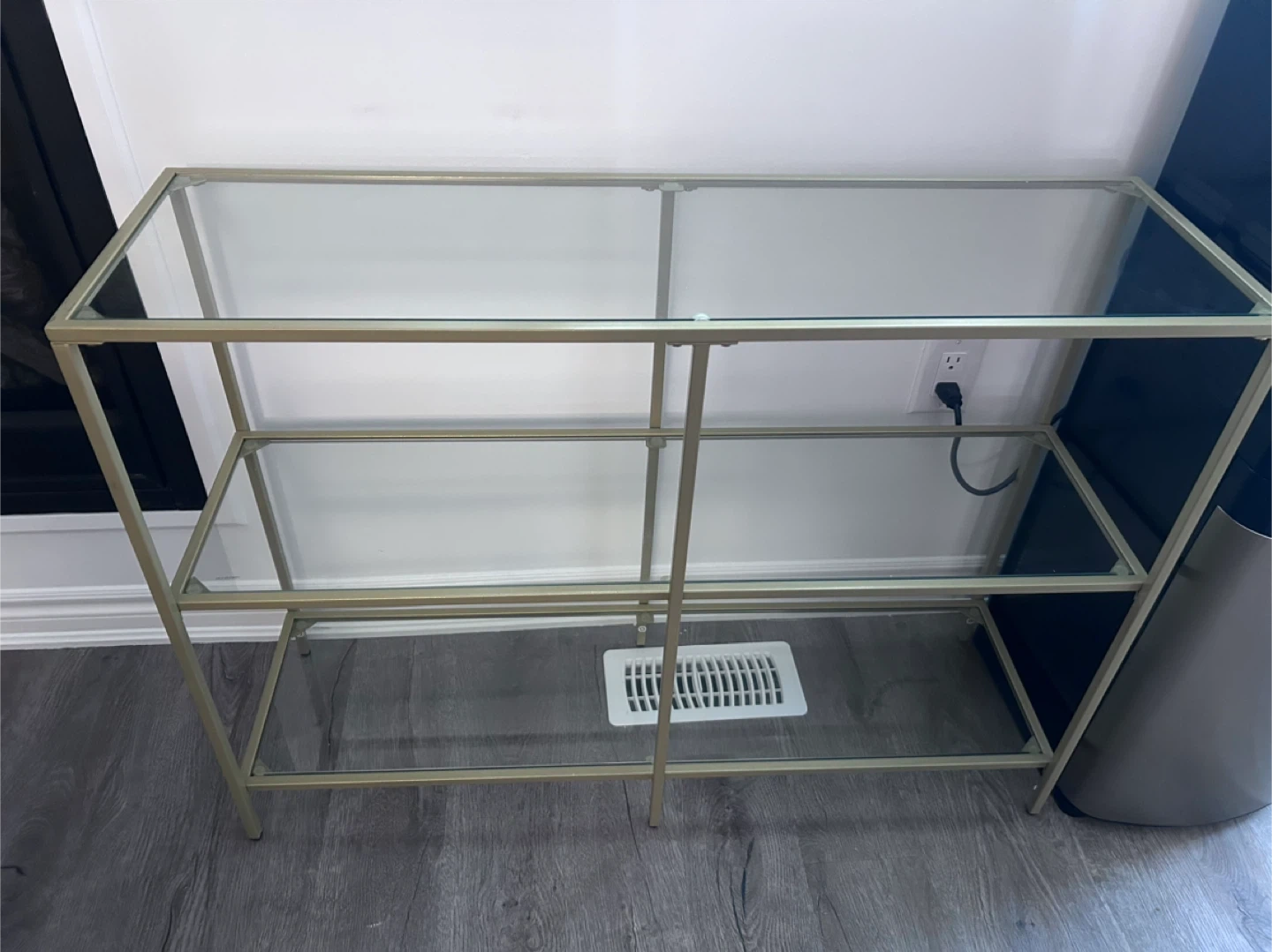 Selling a console table with a gold metal frame and glass shelves. It's in great shape and would look lovely in an entryway or living room!