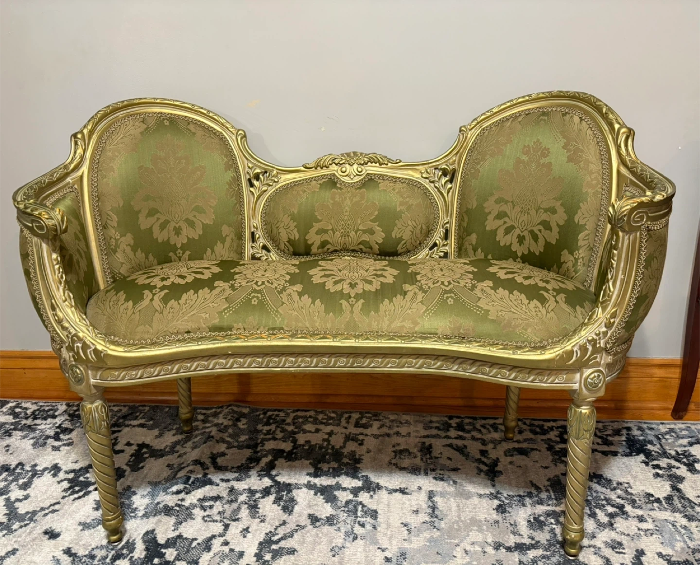 10Selling a loveseat with an antique-inspired design! It features a beautiful green and gold colour scheme and would make a great addition to any living room or sitting area.