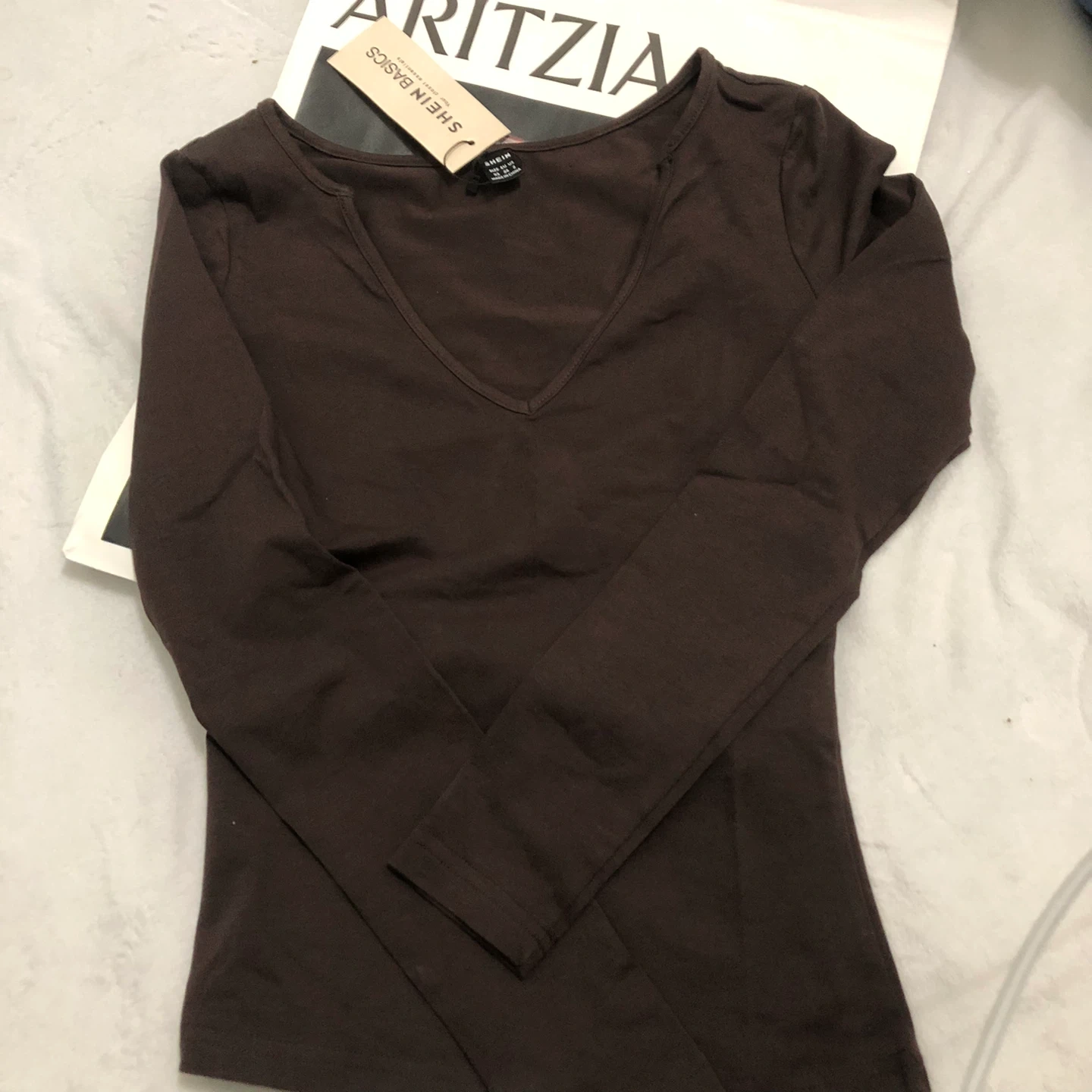 Selling a SHEIN Basics long sleeve top in brown. It's a size small and in great condition. Perfect for layering or wearing on its own!