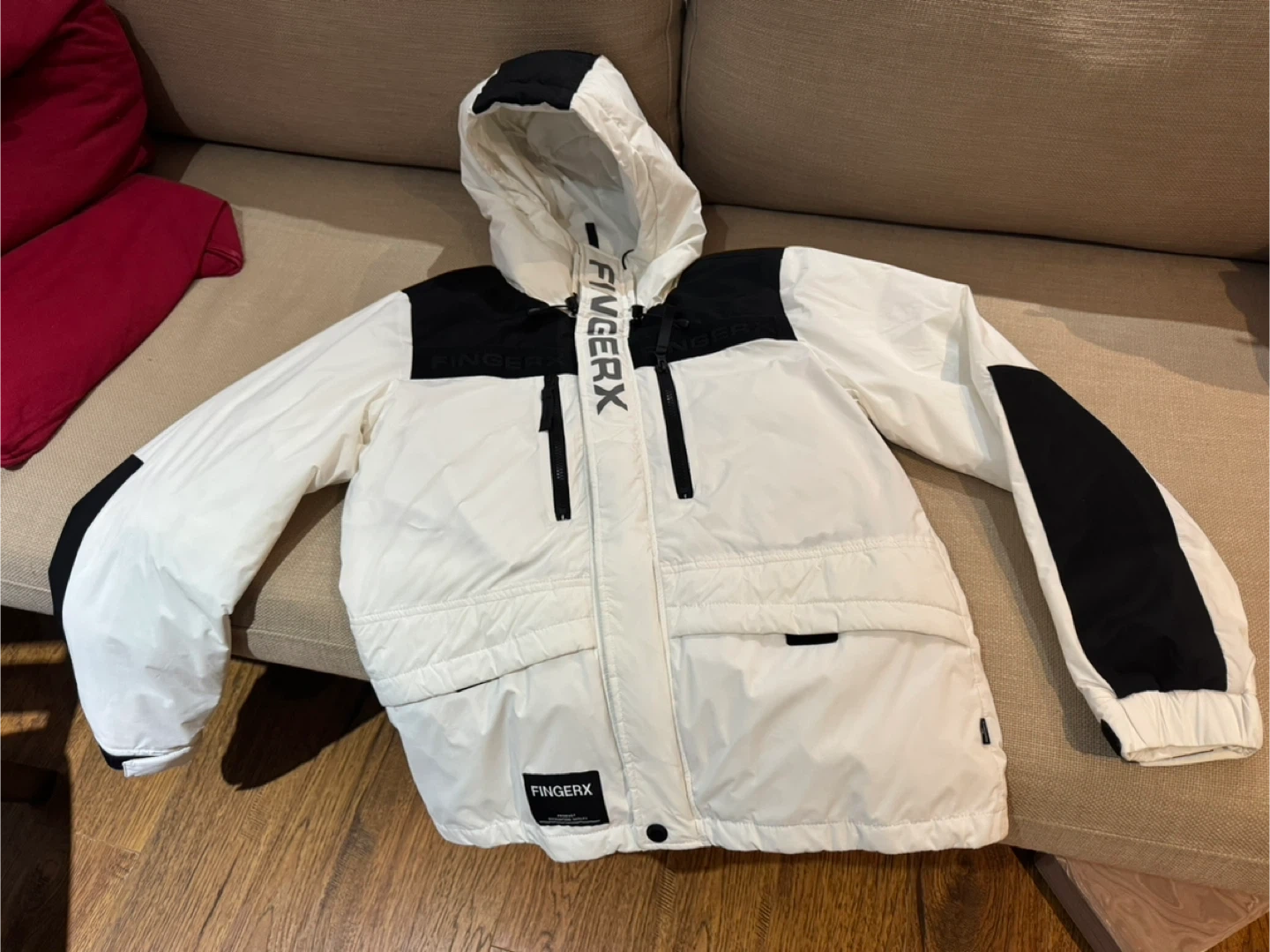 Selling a FINGERX winter jacket in white and black. It's a stylish and warm option for the colder months. The jacket features a padded design, perfect for keeping you cozy during the winter season