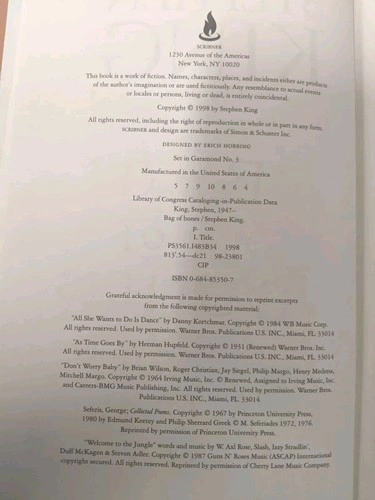 Bag of Bones by Stephen King is a gripping novel from 1998, presented in a Hardcover format. This edition does not include a Dust Jacket. Dive into this English-language masterpiece that will keep you on the edge of your seat with its thrilling plot and engaging storytelling. Add this classic to your collection today and enjoy hours of reading enjoyment.
