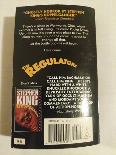 Get your hands on a chilling horror novel with "The Regulators" by Richard Bachman, also known as Stephen King. This 1997 First Edition Canadian Printing paperback book is a must-have for any horror book enthusiast. Dive into a gripping tale that will keep you on the edge of your seat as you explore the twisted world created by the master of horror himself. Any claims of edition that differ from the photo will defer to the photos for accuracy.