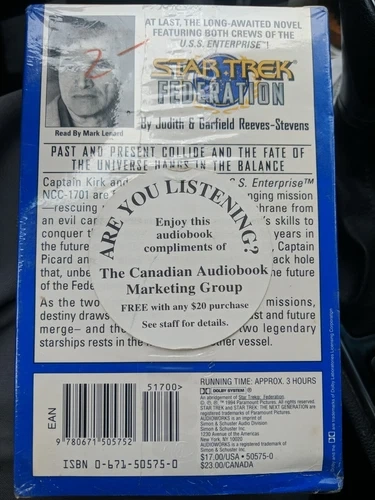 Embark on a journey through the vivid realms of science fiction with the vintage "Star Trek Federation" audiobook on cassette. A must-have for avid fans and collectors, this immersive tale is a part of the iconic Star Trek series, inviting listeners to explore the expansive universe filled with adventure and mystery.