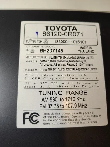 Enhance your 10-11 Toyota RAV4's audio experience with the genuine OEM 861200R071 Fujitsu Ten head unit. This high-quality AM/FM CD player is designed to seamlessly integrate with your vehicle's factory system, ensuring a smooth and responsive user interface. A perfect match for your Toyota, this head unit is built with the craftsmanship you'd expect from a trusted brand like Toyota, originating from Thailand.