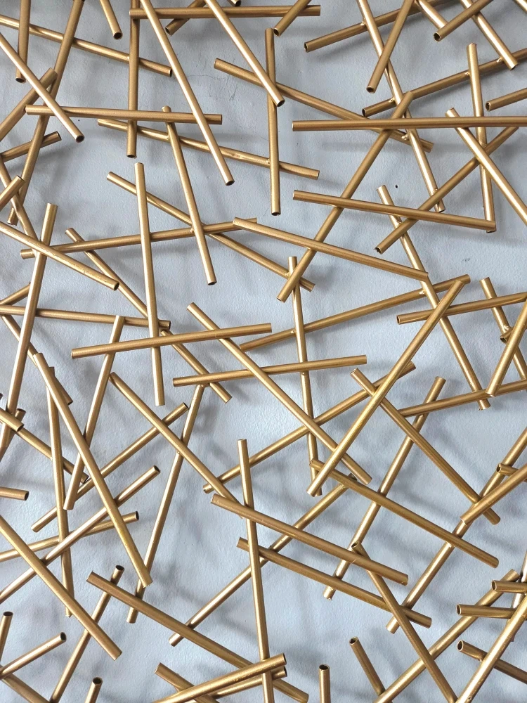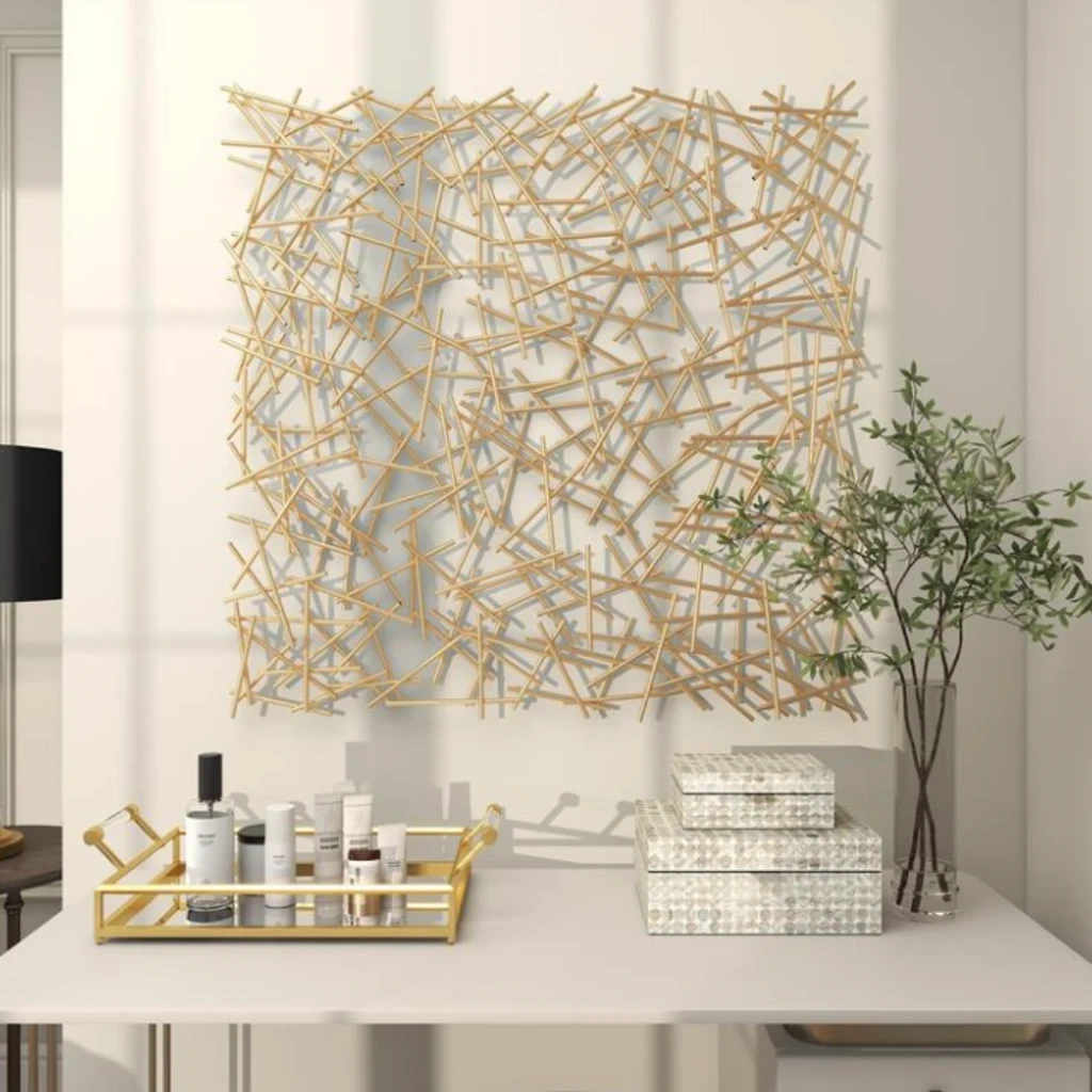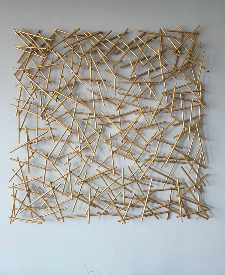 A stack of golden strands to add visual interest to your walls. Made of high-shine metal, it almost looks like a game of pick up sticks, but for the wall. Easy to hang for an instant update to your wall decor.