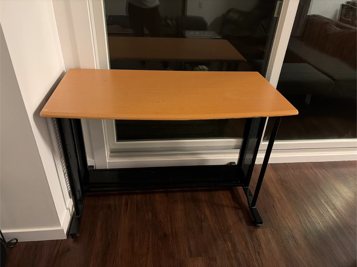 Selling a small desk with a wooden top and black metal frame. It's in good condition and perfect for a small space or as a side table. It's sturdy and has a nice, clean look!