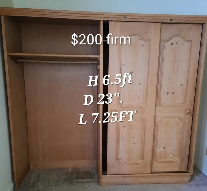 Selling a wooden wardrobe in good condition! It measures 6.5 feet in height, 23 inches in depth, and 7.25 feet in length. Perfect for adding extra storage to your space