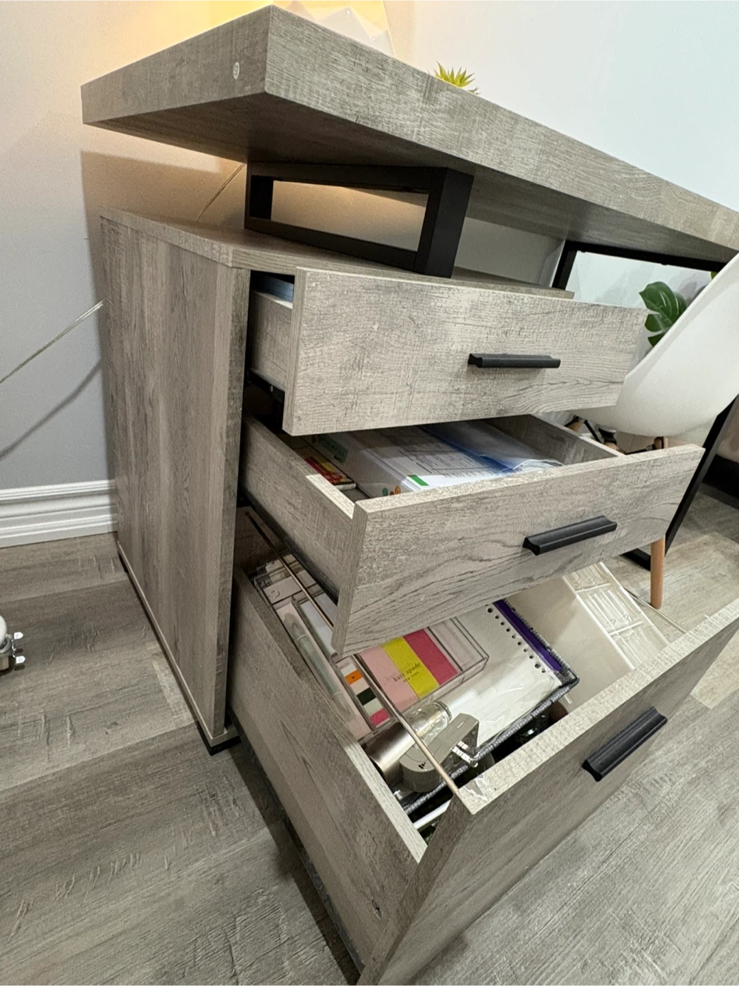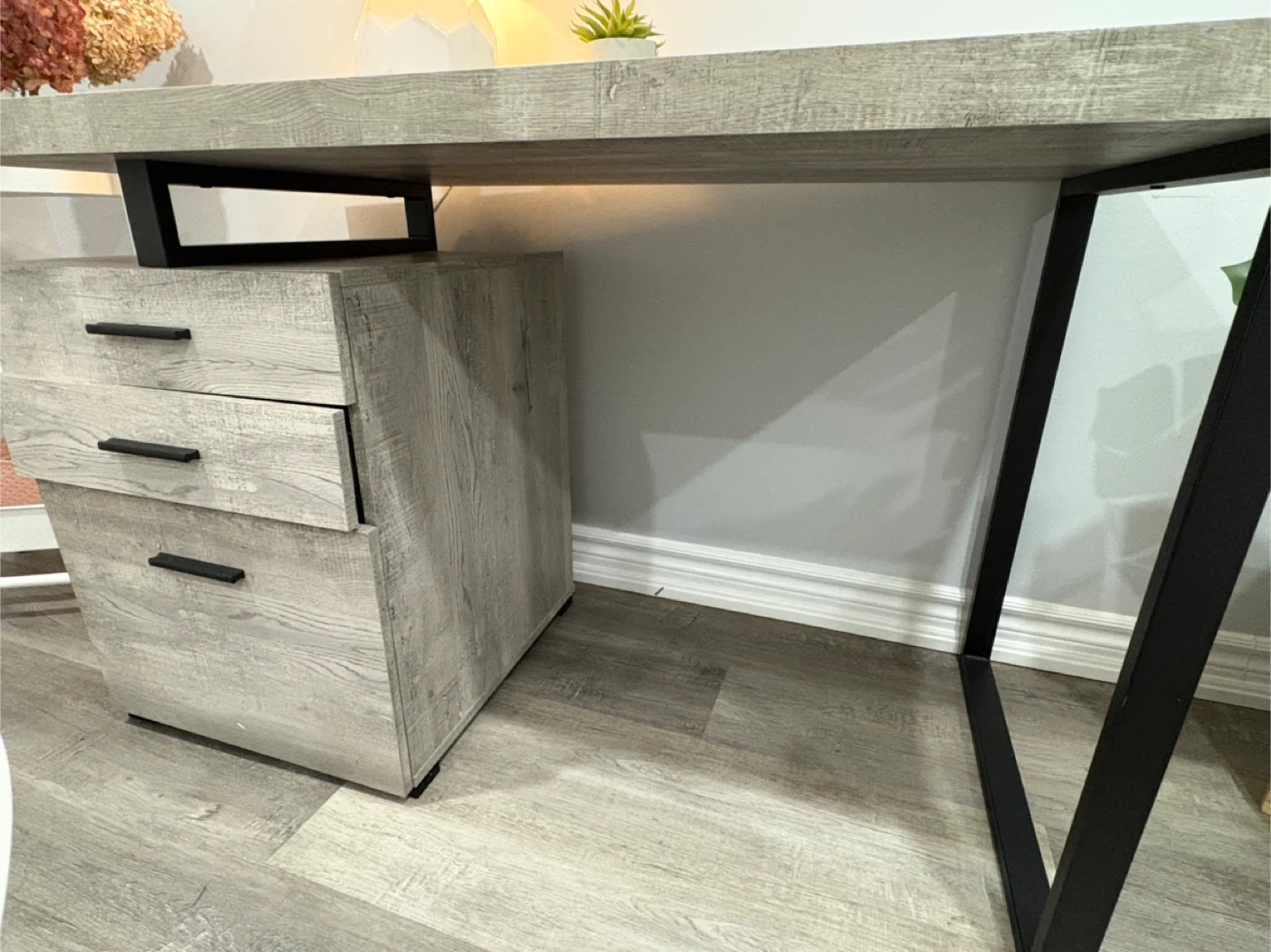 Selling a desk with a grey woodgrain finish. It features a set of drawers for storage. Perfect for a home office or study space!