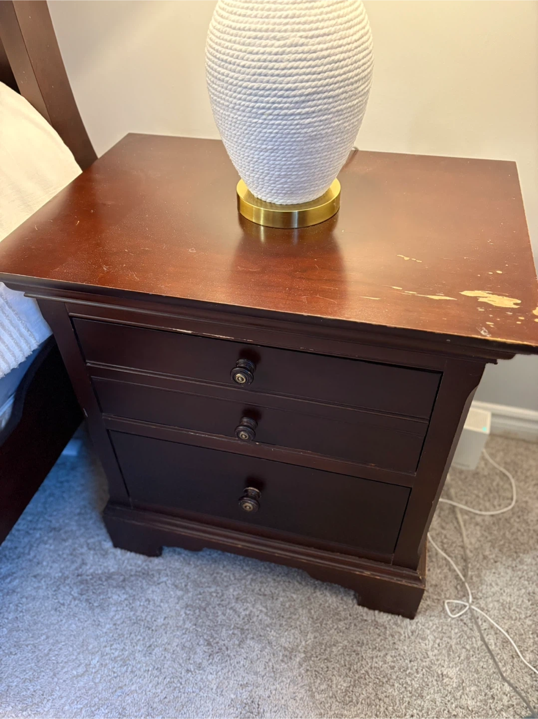 Dark wood sleigh bed frame in good condition. 2 matching night tables. It's a beautiful piece that would look great in any bedroom!