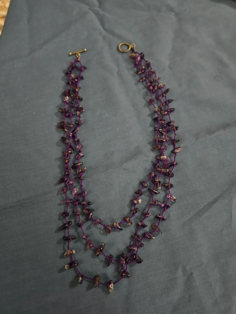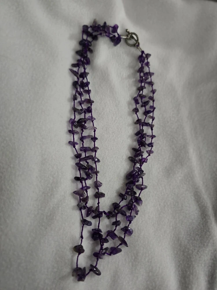 Selling a lovely purple amethyst beaded necklace! It has a three-strand design that's quite unique. Perfect for adding a touch of elegance to any outfit.
