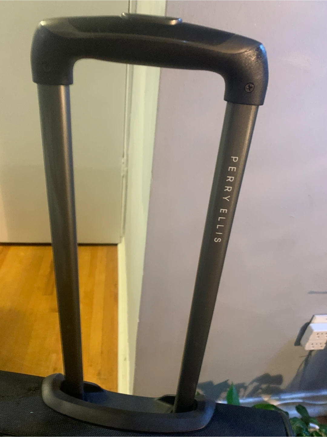Selling a Perry Ellis Portfolio carry-on suitcase. It's black with grey accents and has a telescoping handle. The interior has a plaid pattern with blue trim. Perfect for your next trip!