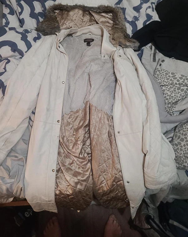 Cozy Tan Jay winter coat featuring a faux fur hood! The outer material is a light tan colour and the inside is lined with a soft, plush material for extra warmth. The lining of the coat is a quilted gold colour.