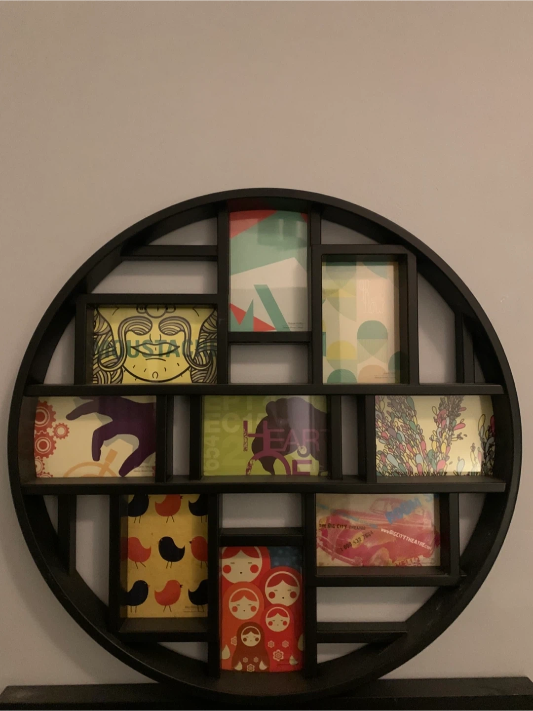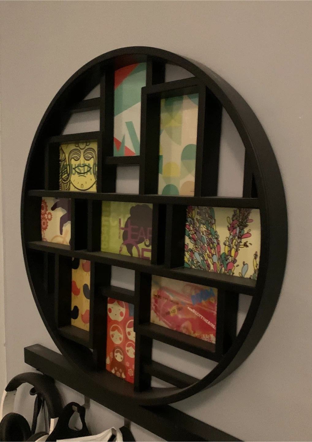 Here's a unique round wall decor piece in black! It has multiple sections to display photos or other small items. It's a great way to add some visual interest to any room