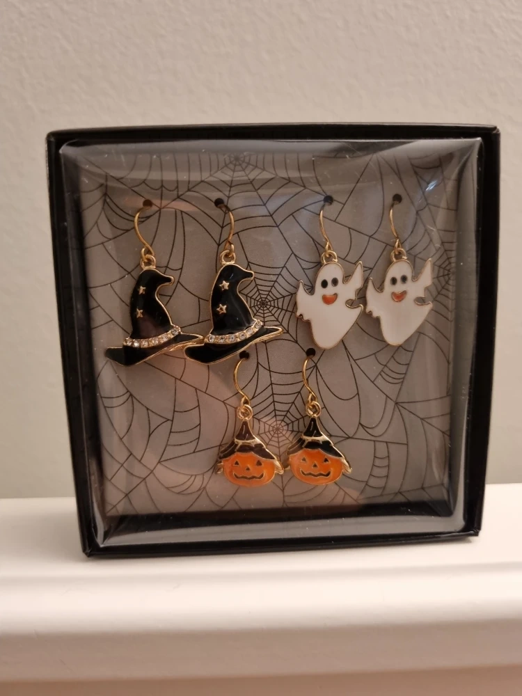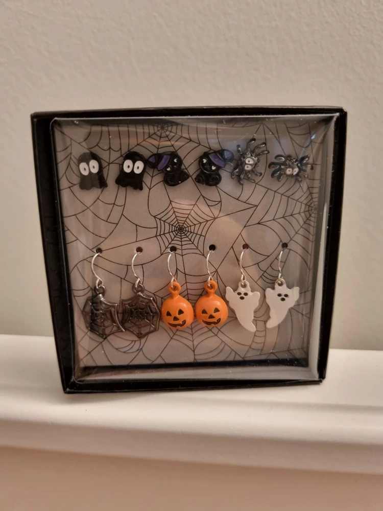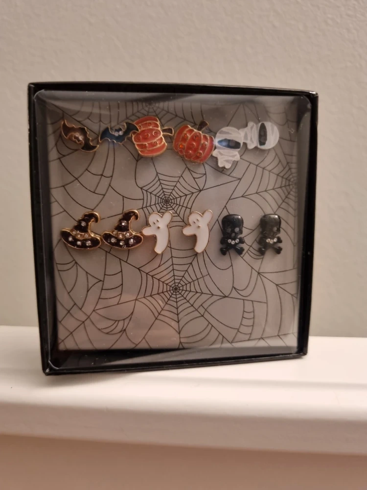 Selling a set of spooky-themed earrings, still brand new in the box! The box includes various designs like bats, pumpkins, ghosts, witches' hats, and skulls. Perfect for adding a fun touch to your outfit or cute secret santa or stockings gifts for friends and family 🎁🎄