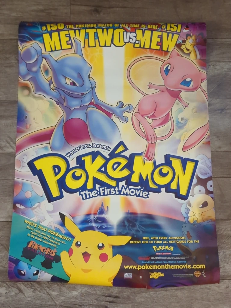 Selling a vintage Pokémon The First Movie poster featuring Mewtwo vs Mew! This poster was a promotional item for the movie's release and includes Pikachu. A great addition for any Pokémon fan or collector!