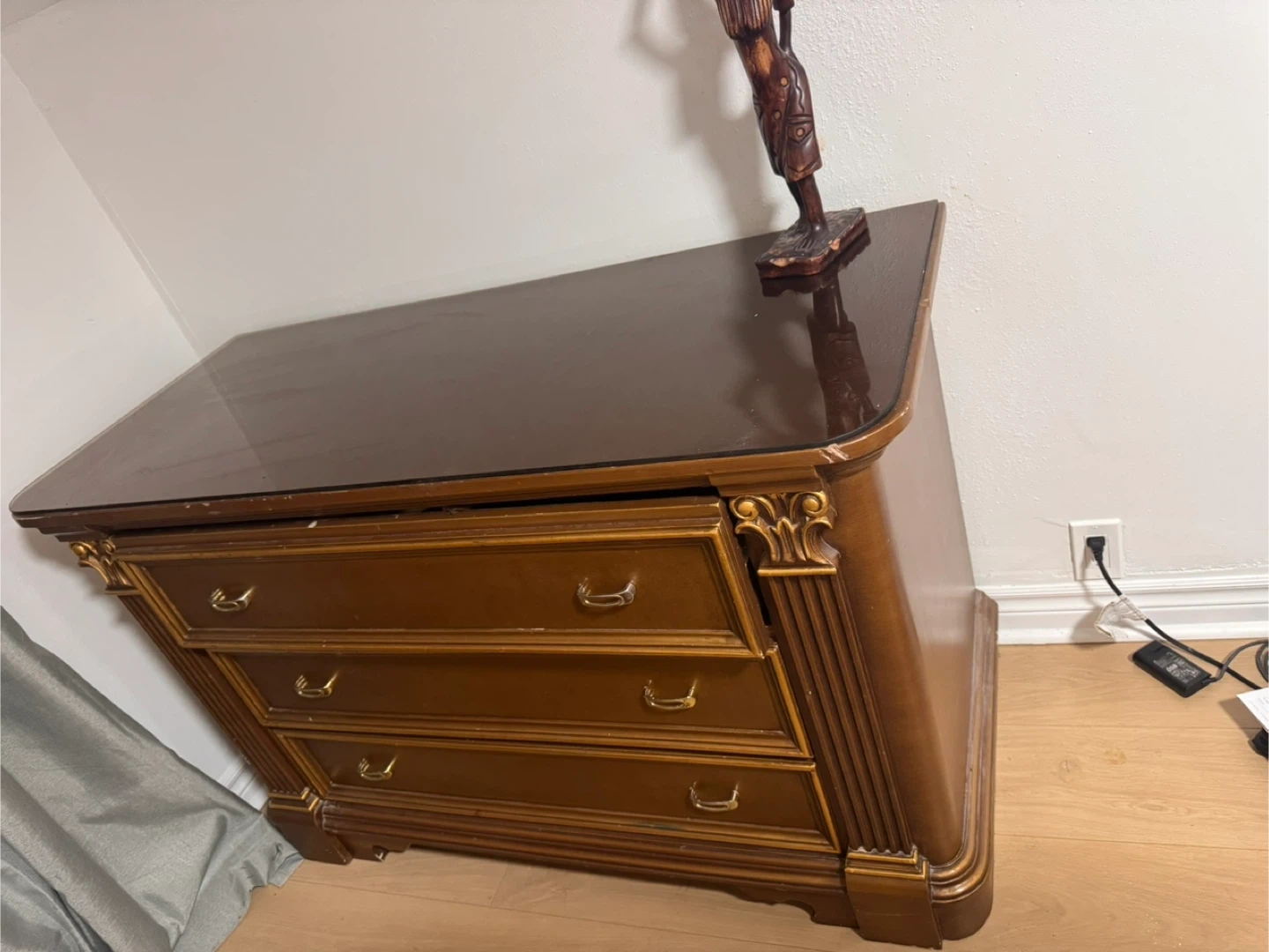 Selling a beautiful antique-style bed frame and dresser set. The set features intricate detailing and a rich, warm wood finish. Perfect for adding a touch of elegance to your bedroom!