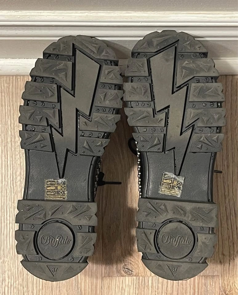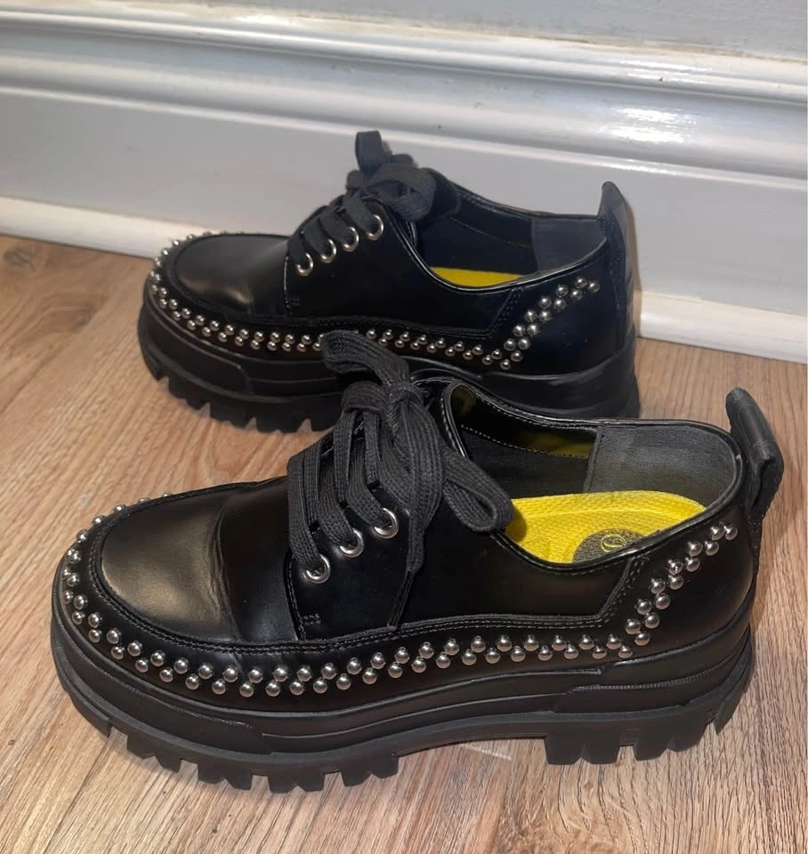 Worn once, in excellent condition. Minor signs of wear (some wrinkling, some scratches on the heels and stain/ discolouration at the toe of one of the loafers) as shown. Size US 6.5, UK 4, EU 37. They're slightly heavy. Chic black platform shoes by Buffalo. Vegan nappa leather with silver-tone rivets/studs.