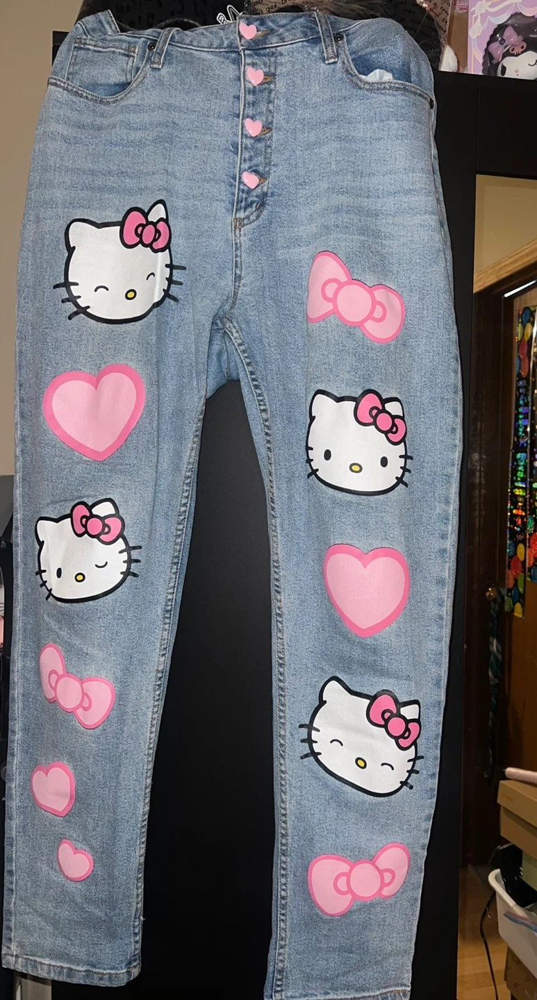 Super cute Hello Kitty jeans in a size 11! They feature Hello Kitty and heart designs. Perfect for any Hello Kitty fan! It’s my dream jeans but unfortunately is not fit me so I didn’t use them very often I’m also selling a belt with hello kitty designs that go perfectly with the pants!