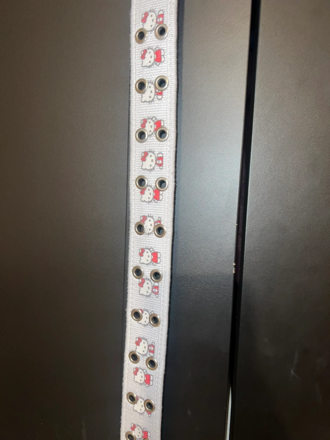 Cute Hello Kitty belt in white! Features the iconic Hello Kitty design along the entire length of the belt. Perfect for adding a touch of kawaii to any outfit