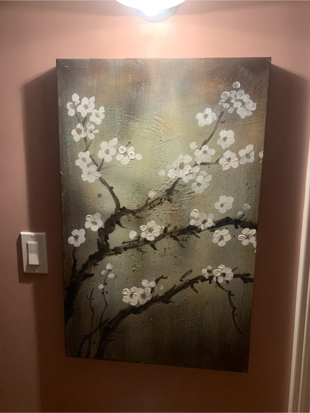 A beautiful floral painting, perfect for adding a touch of elegance to any room! The artwork features delicate white blossoms on branches, set against a neutral background. It's in great condition and ready to hang. 3 piece set.