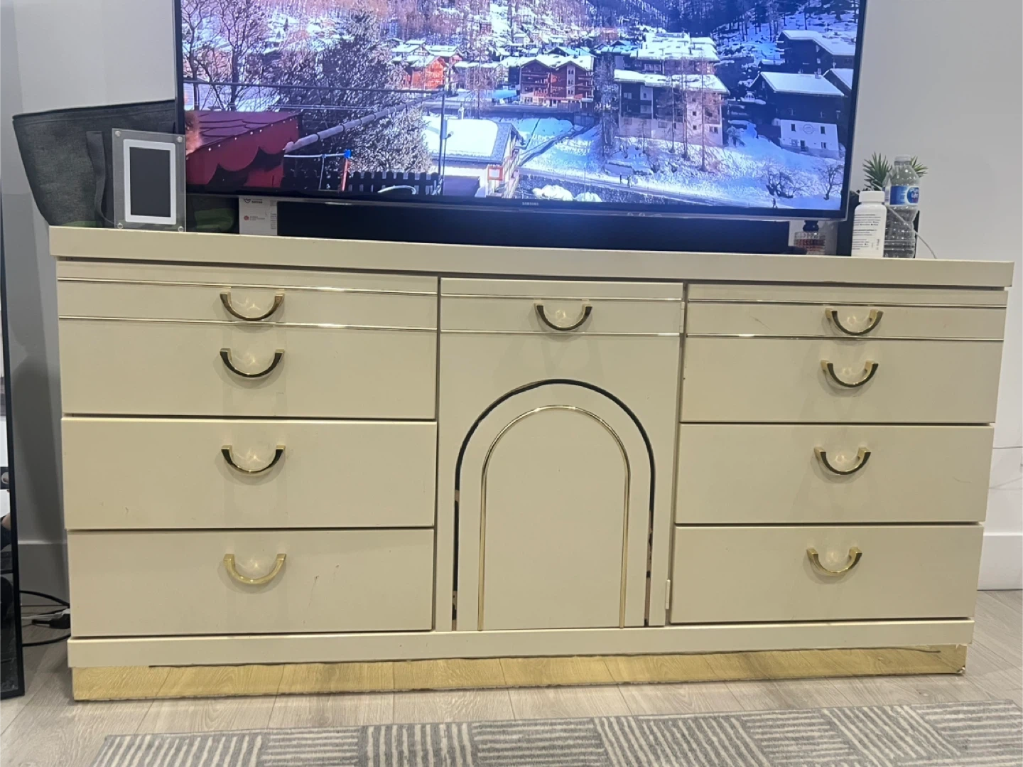 Selling a vintage dresser/ TV stand . It has a unique design with gold accents. It's a great piece for adding some retro charm to your bedroom or living space