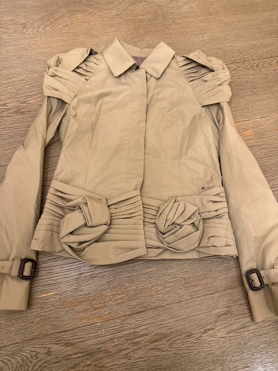 Selling a stylish Burberry jacket (look like)in a lovely beige colour. It features unique pleated detailing and buckle accents on the sleeves. It's in great condition and ready for a new home!