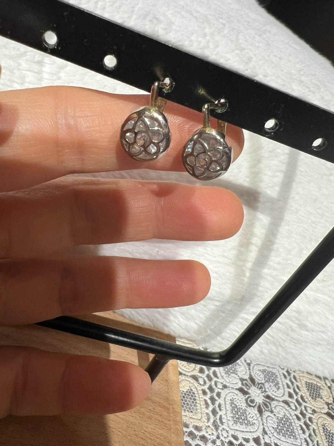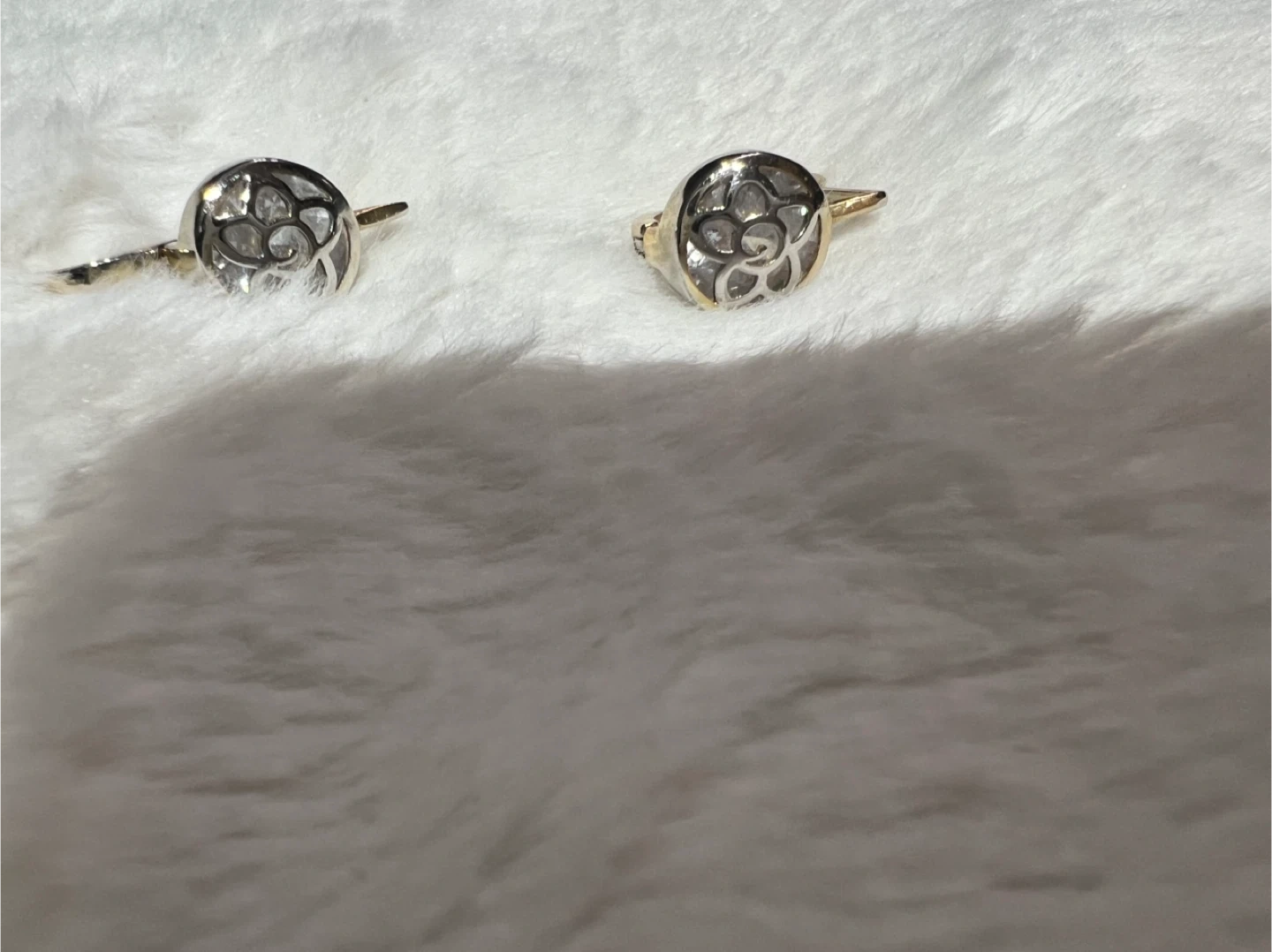 Selling a pair of drop earrings with a lovely floral design. They have a gold and silver tone. Perfect for adding a touch of elegance to any outfit!
