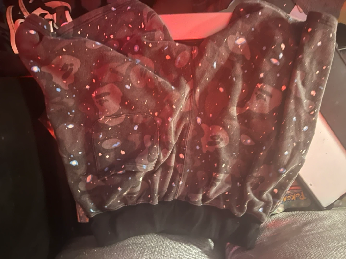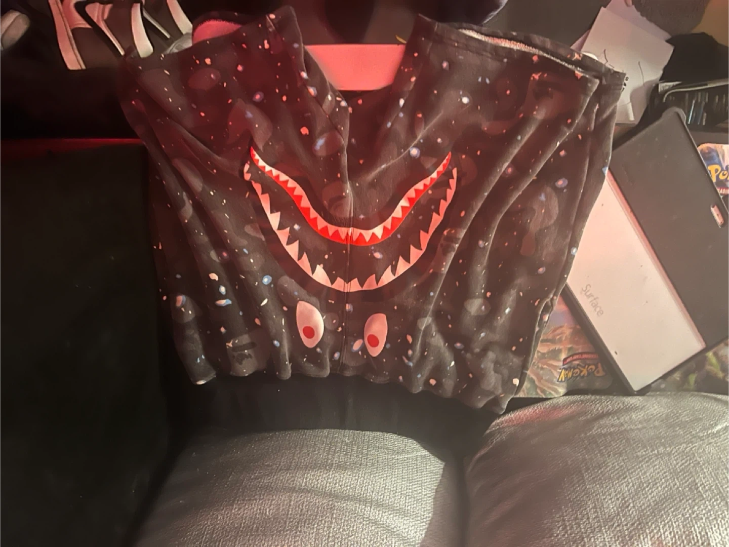Selling a BAPE (Bathing Ape) Galaxy Shark hoodie in size XL! It features a cool galaxy print and the iconic shark design. In good condition and ready for a new home