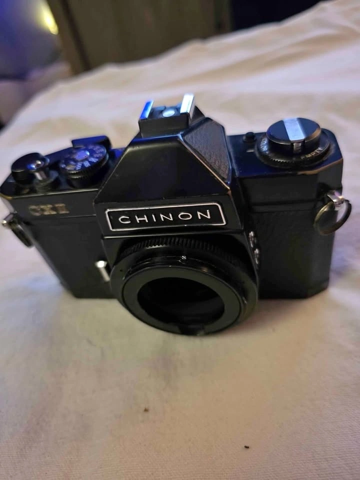 Chinon CS 35mm SLR film camera released in the 1970s. The camera has a fully mechanical shutter with speeds from 1s to 1/1000s, plus a 'B' setting for bulb exposure. It features a built-in light meter with a film sensitivity range of ISO 10 to 1600.