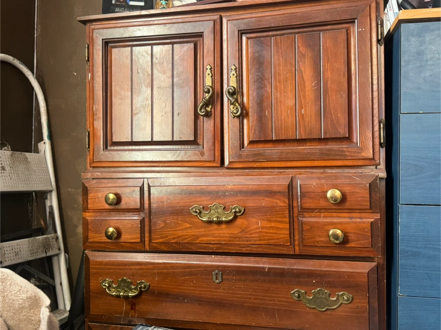 Solid wood armoire dresser with two doors at the top and multiple drawers below. Features brass hardware and a warm wood finish. This piece offers ample storage for clothing and other items.