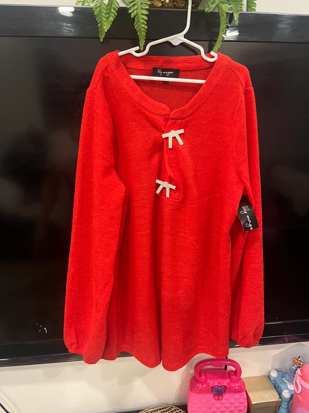 Here's a cute red long-sleeve top from Lily Morgan! It features two decorative bows and a comfortable design. Perfect for adding a pop of colour to your wardrobe!