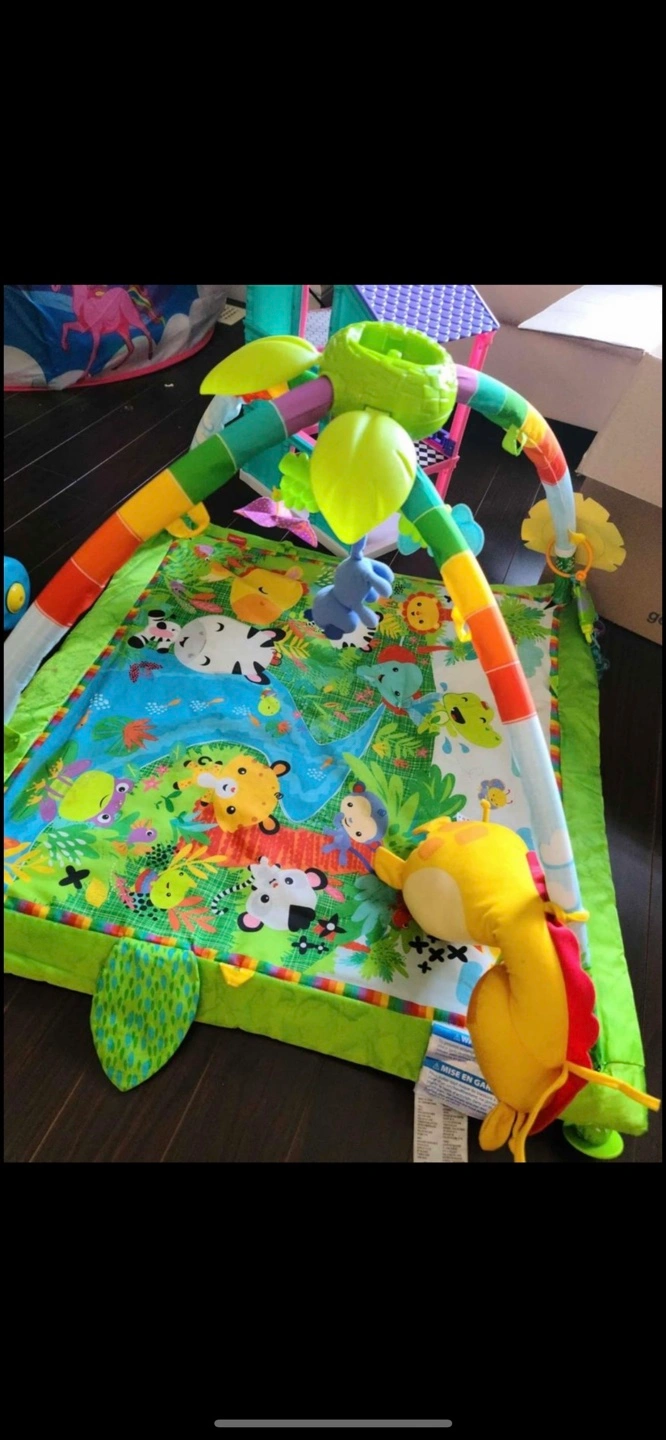 Selling a gently used Fisher-Price Rainforest Melodies & Lights Deluxe Gym! It's in great shape and ready for a new little one to enjoy. The play mat features a colourful rainforest design with various animal characters. It also includes hanging toys and lights to stimulate your baby's senses and promote development