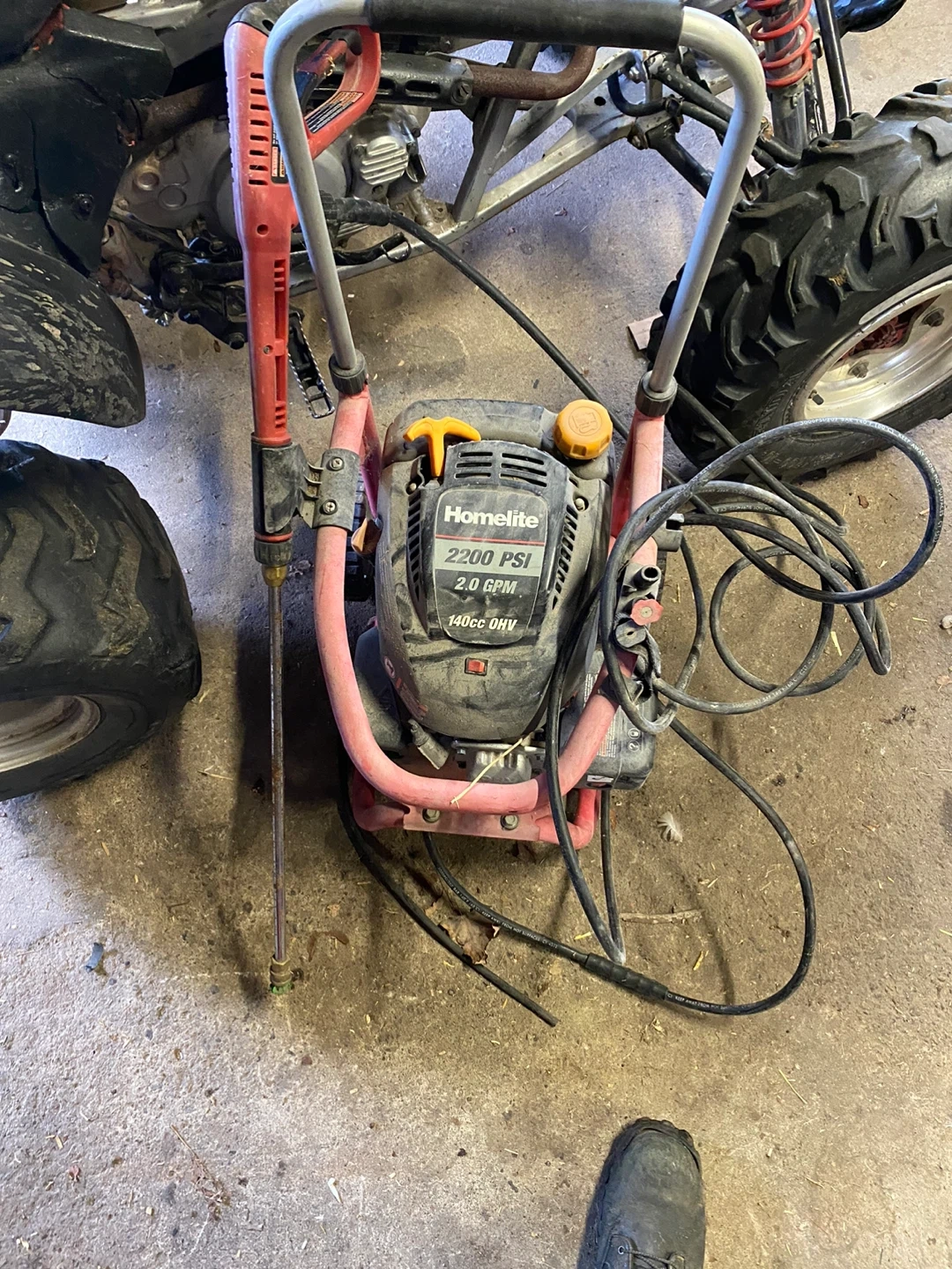 Selling a Homelite pressure washer. It's a 2200 PSI unit with 2.0 GPM and a 140cc OHV engine. Could use a bit of cleaning, and a new pump but motor works great.