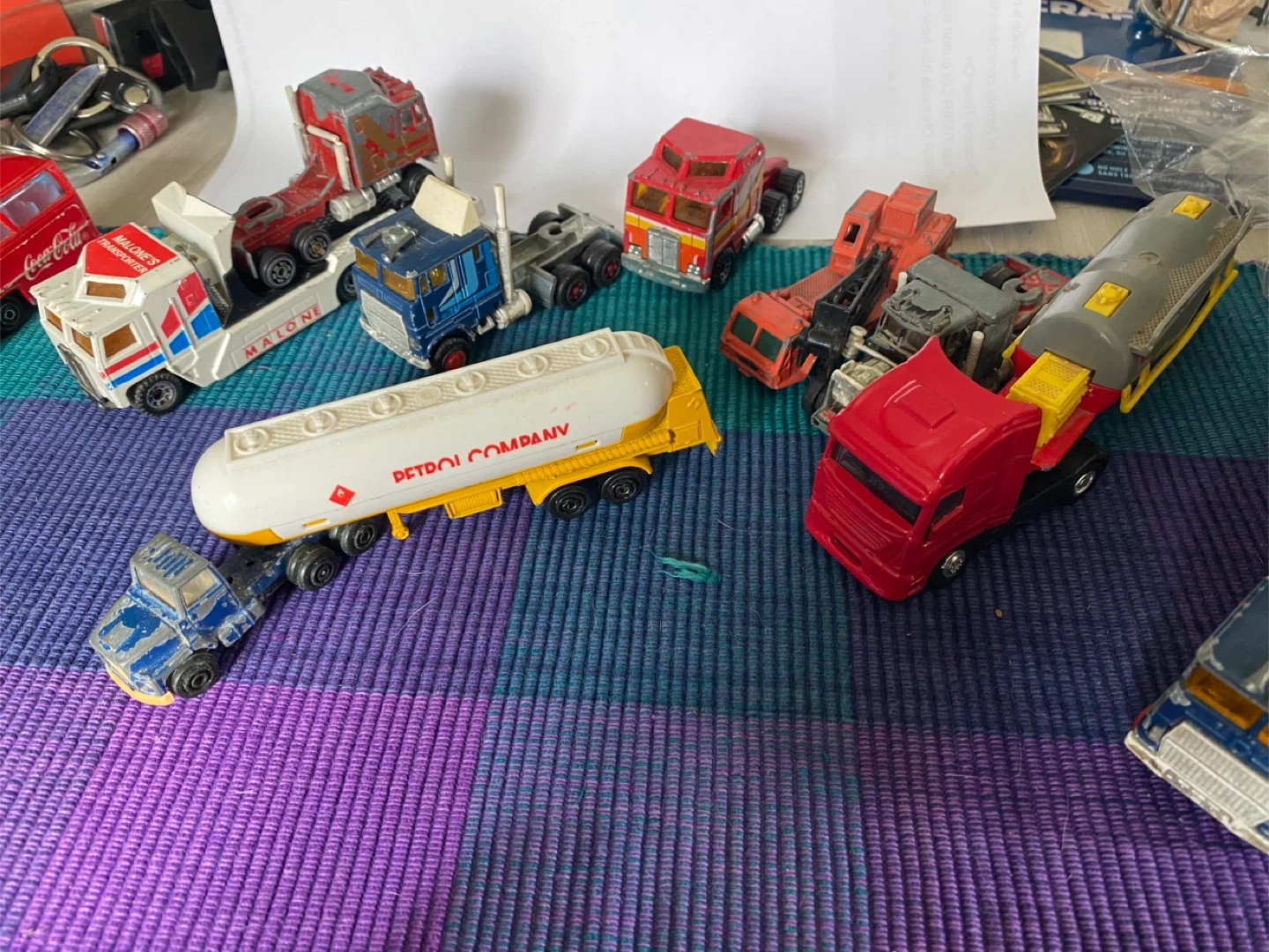Selling a collection of vintage diecast toy trucks! There are various brands and styles, including Shell, Goodyear, and others. They show signs of wear and play, but are still fun for collectors or kids who love trucks