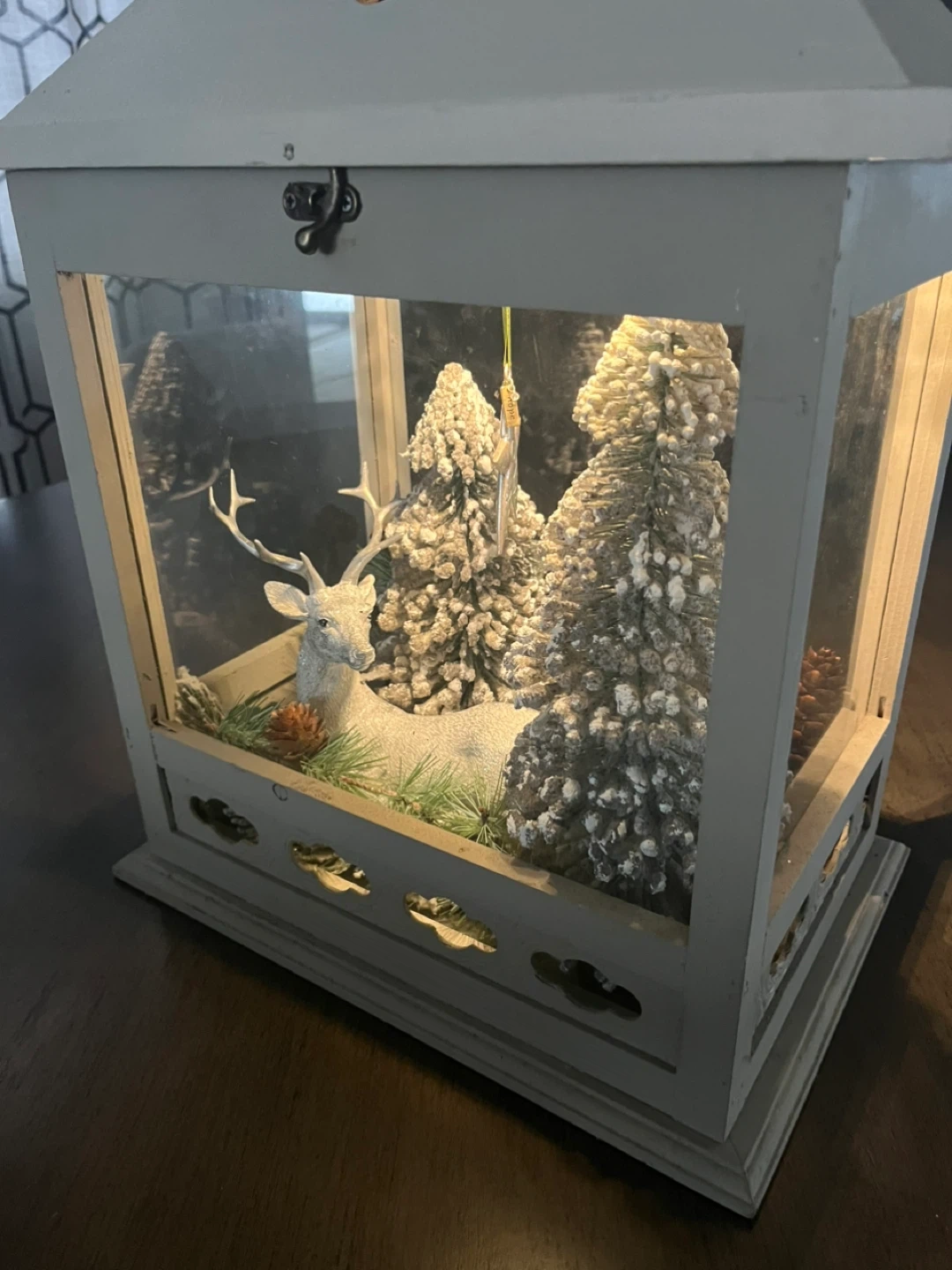 Christmas lantern featuring snowy trees, a deer, and a star ornament. It's perfect for adding a festive touch to your home this holiday season!