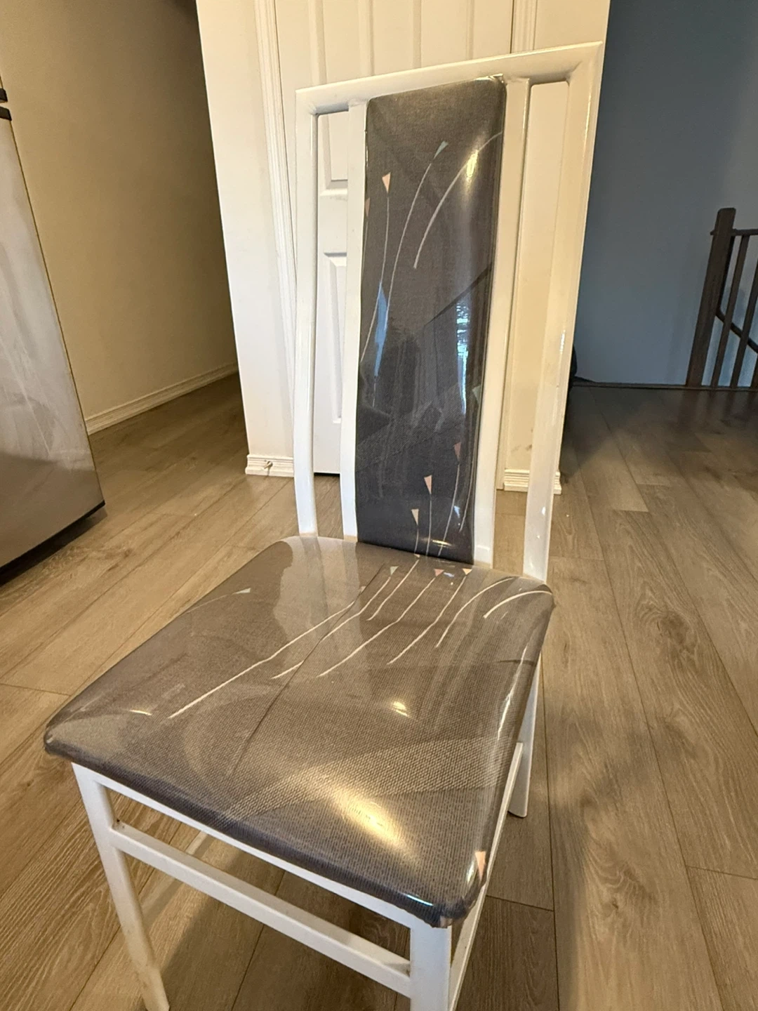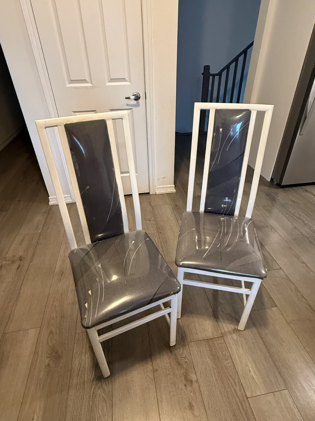 They have a white frame and a grey patterned seat and back.