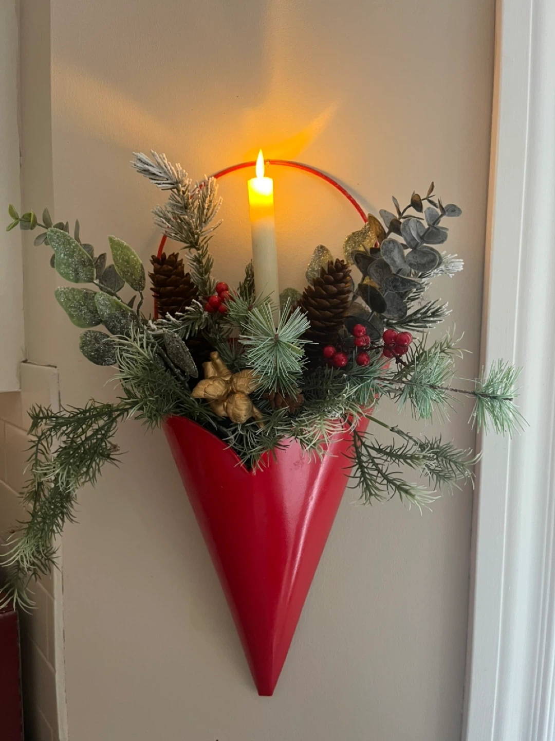 Door/wall hanging with festive holiday decor. It features pine cones, greenery, and berries, perfect for adding a touch of seasonal cheer to your home. Flickering candle is battery operated. Would make a lovely gift for a senior in LTC!