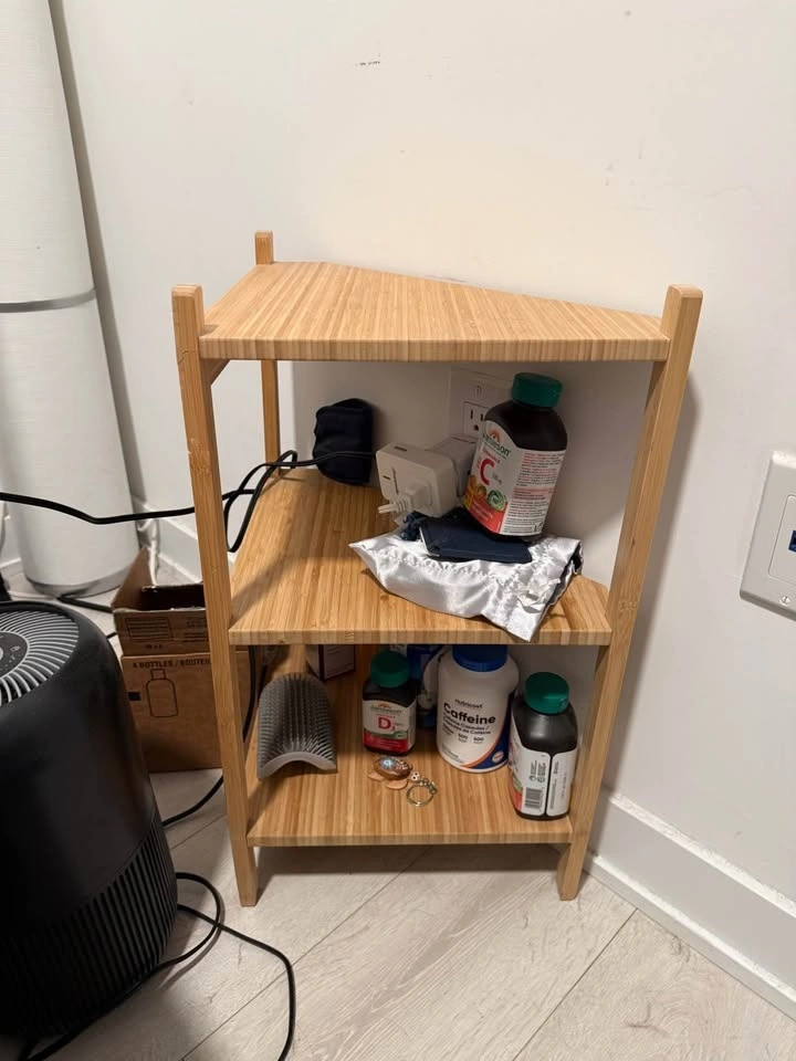 Natural bamboo shelf from IKEA’s RÅGRUND bathroom series — durable and water resistant.