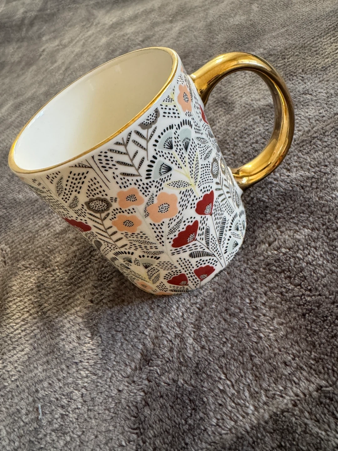 Selling a charming mug with a floral pattern and a gold handle. It's in great condition and would be a lovely addition to your kitchen or a thoughtful gift for someone special