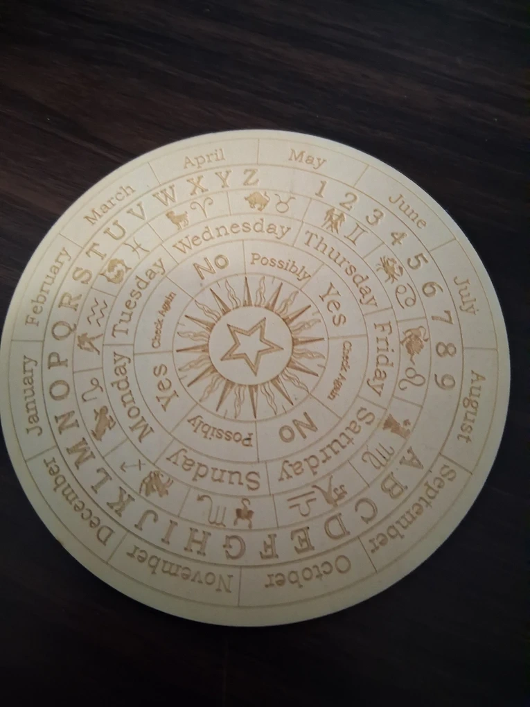 This is a unique wooden pendulum board featuring zodiac signs, days of the week, and months. It also includes 'Yes,' 'No,' and 'Possibly' options, along with numbers. Perfect for adding a touch of mystique to your space!