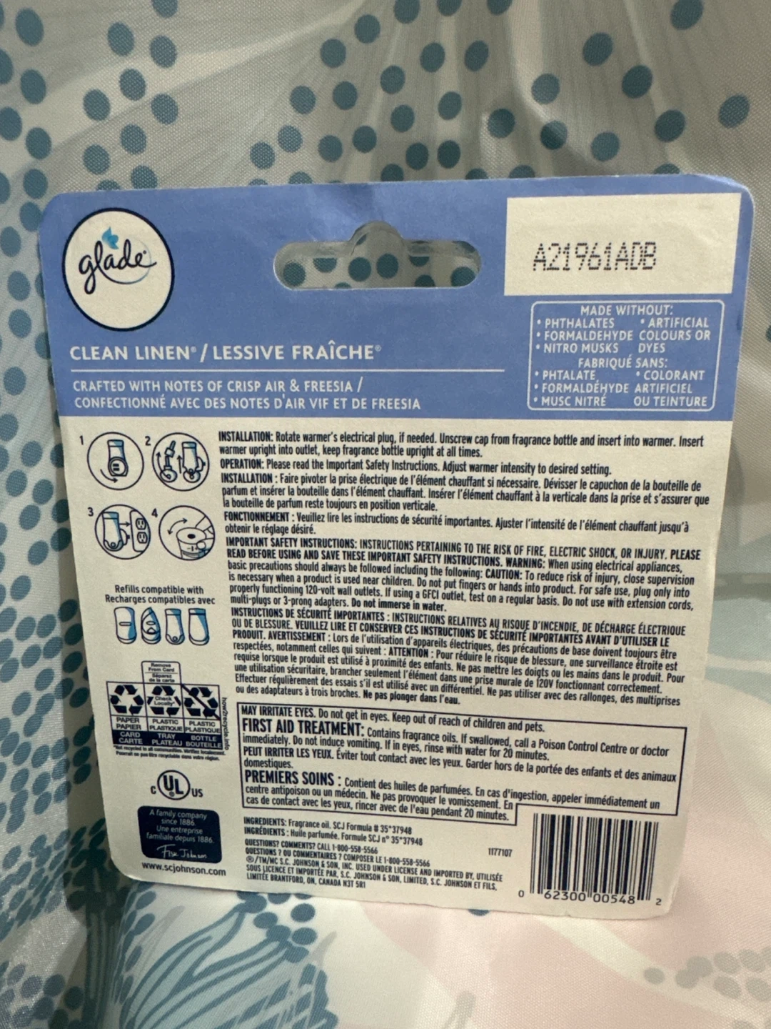 Selling a Glade Clean Linen PlugIns scented oil warmer. This is perfect for adding a fresh scent to any room in your home. It's most adjustable for any size room and provides max control for up to 60 days! Refills are compatible with Glade PlugIns.