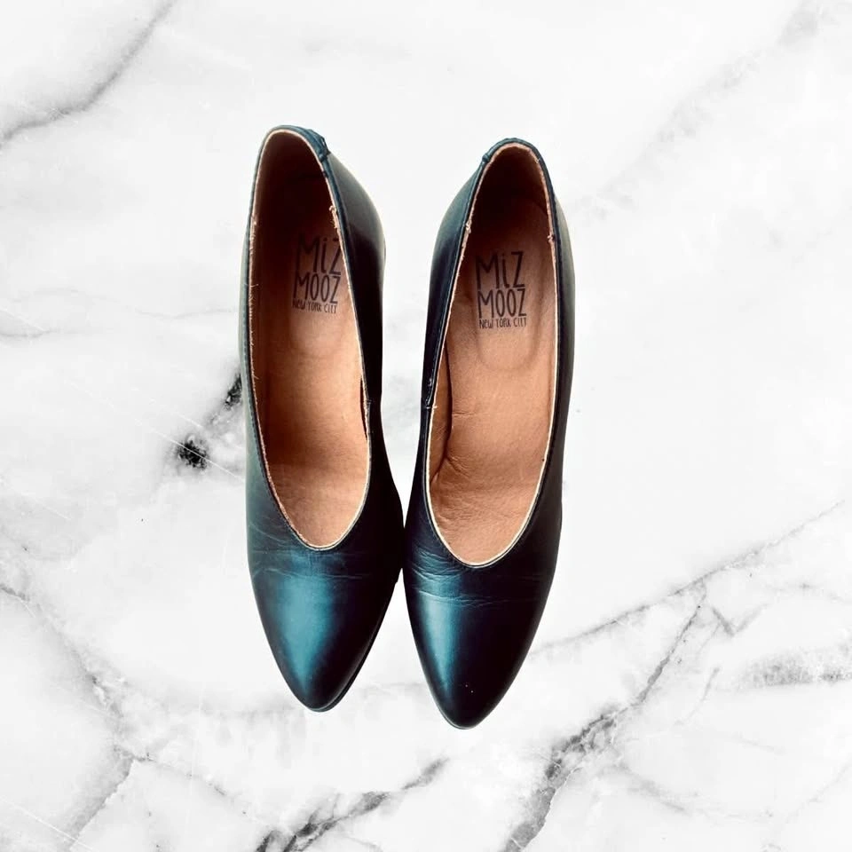 Classic and timeless Miz Mooz black leather heels. Made with genuine leather uppers and cushioned insoles for comfort. Sleek pointed toe design makes them perfect for work, events, or everyday wear. High-quality craftsmanship and durable sole.