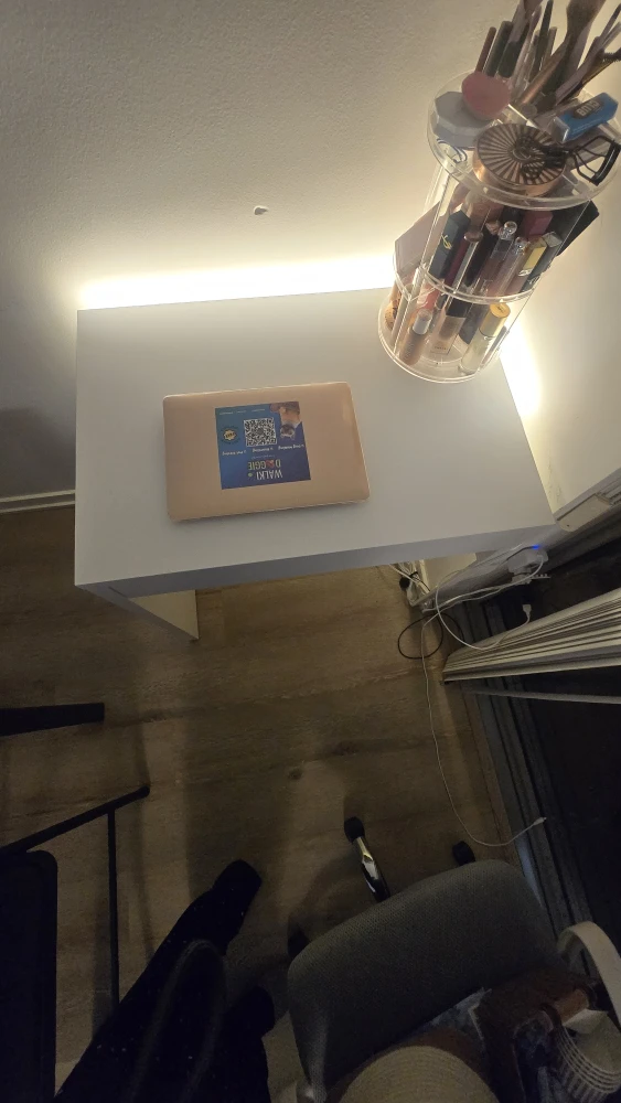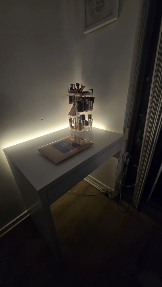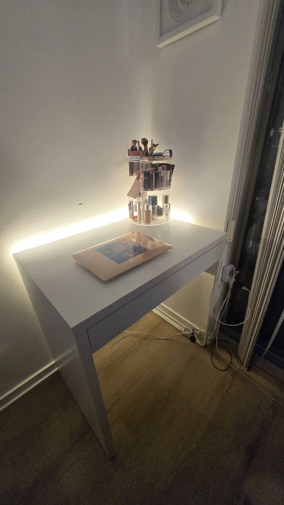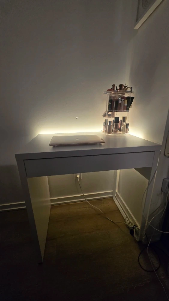 Sleek and space-saving white desk featuring a smooth pull-out drawer and integrated LED lighting. Perfect for small rooms, study areas, or makeup setups. Modern, sturdy, and ready to brighten your workspace.