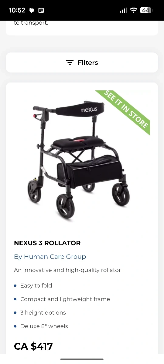I'm selling a Nexus 3 Rollator by Human Care Group.It's an innovative and high-quality rollator that's easy to fold and has a compact and lightweight frame. It also features 3 height options and deluxe 8" wheels.