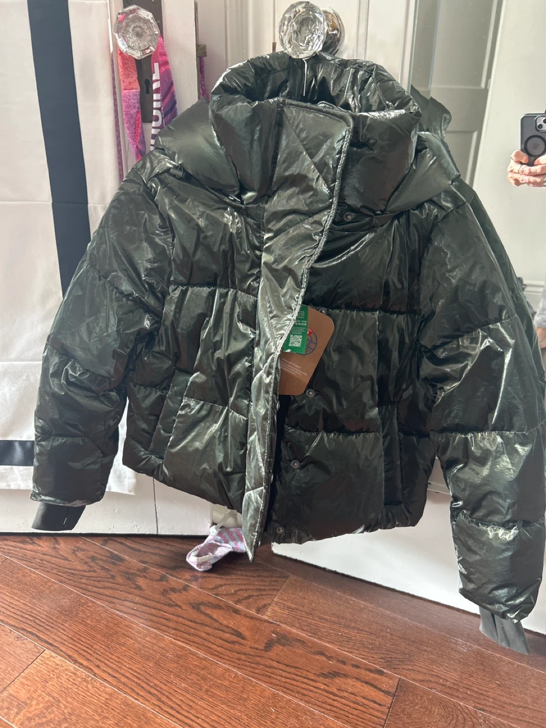 Selling a GAP puffer jacket in size XS Petite. however, it fits larger is in the shiny dark green colour It's a stylish and cozy jacket, perfect for the cooler weather! Originally bought for $208.00