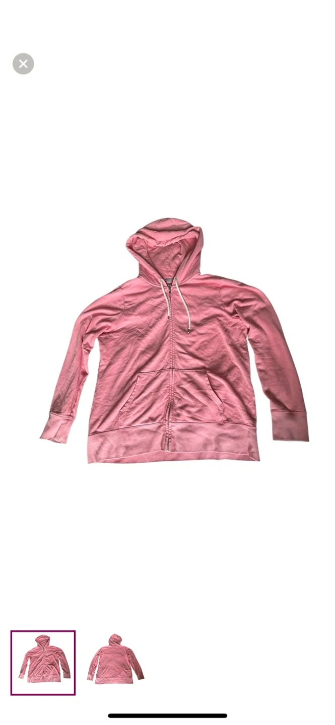 Selling a comfy pink zip-up hoodie! It's perfect for layering or just lounging around the house. It has a hood and front pockets, making it super practical. It's in great condition and ready for a new home! It’s from GAP and size L. It’s %100 cotton.