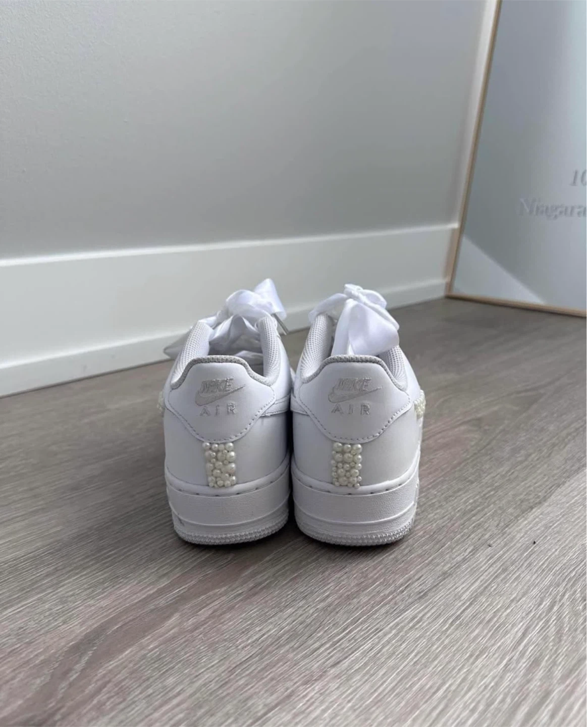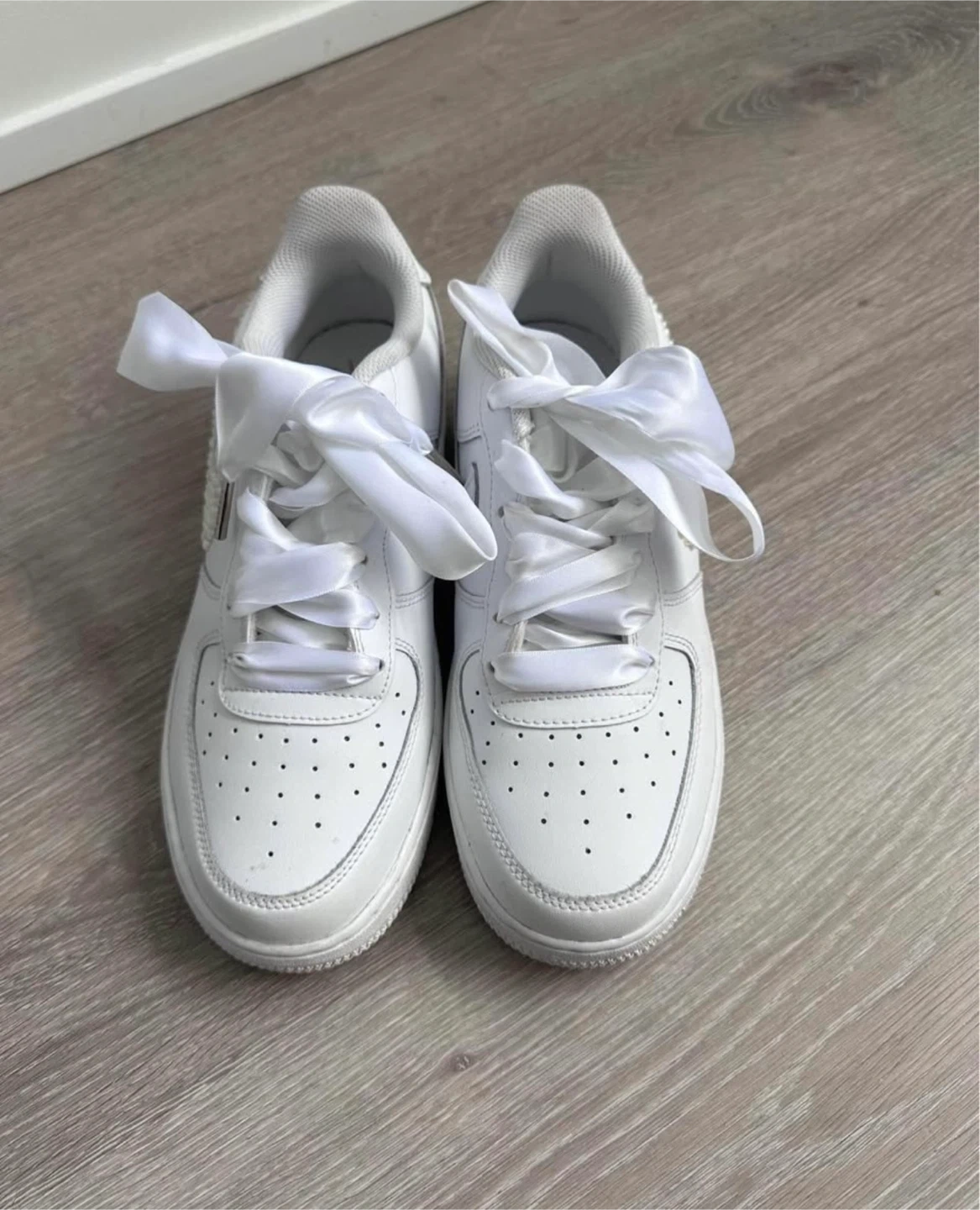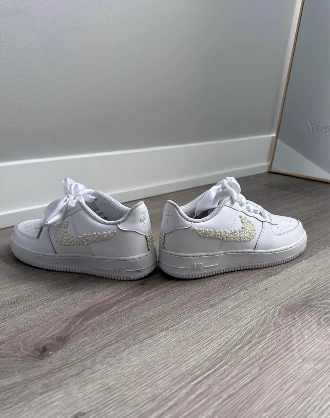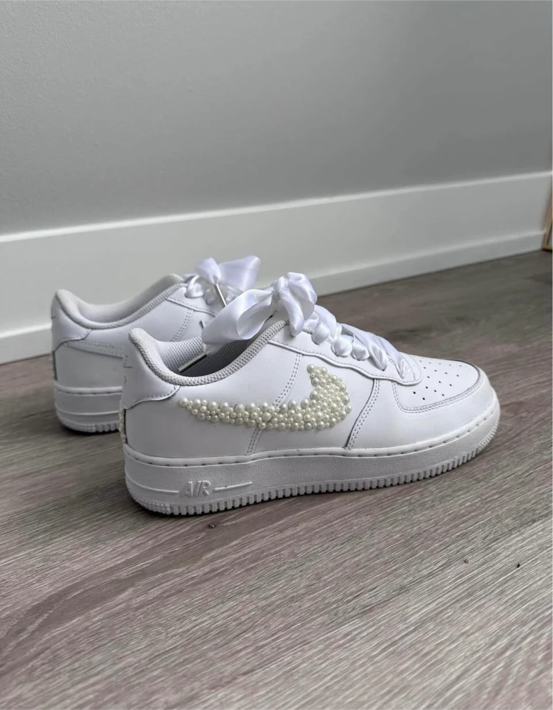 Selling a pair of Nike Air Force 1 sneakers in white with custom pearl detailing on the swoosh and back. They have ribbon laces. Customized for my wedding- Used only for a few hours for my reception. size US 8 and fits 8.5 womens