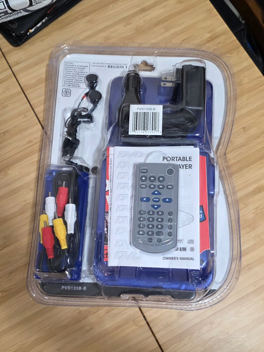 Selling a brand new, in-box Kawasaki 3.5" portable DVD player! It has a widescreen colour LCD display and plays Mini-DVDs and CDs. It also has a 2-hr rechargeable battery and connects to most TVs. Included are a remote control, AC/DC adapters, and earphones