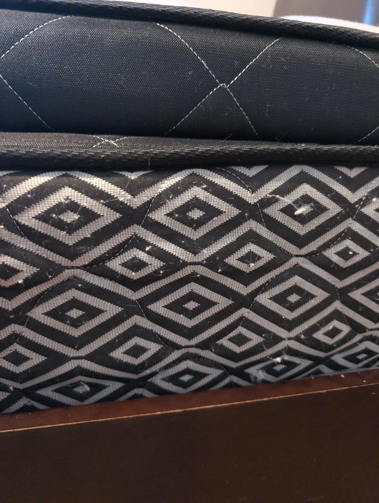Selling a dark brown bedroom set that includes a bed frame and a dresser! The bed frame has a padded headboard and the dresser has multiple drawers for storage. Both pieces show some signs of use. Fair condition best offer