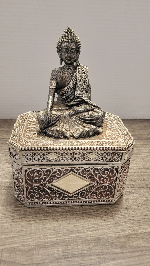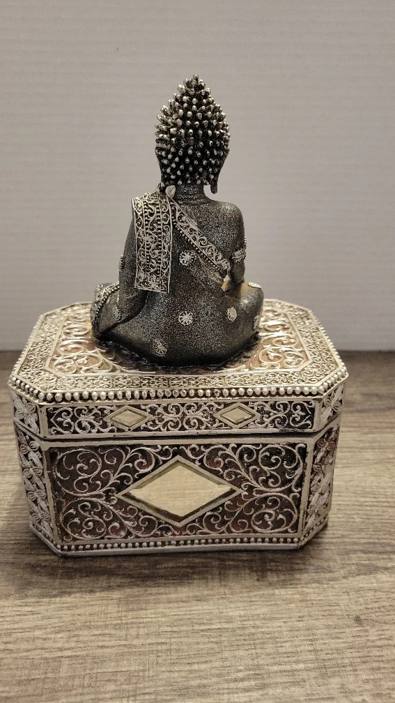 This is a beautiful trinket box with a Buddha statue on top. It has a unique design with intricate details. Perfect for storing jewelry or small items!